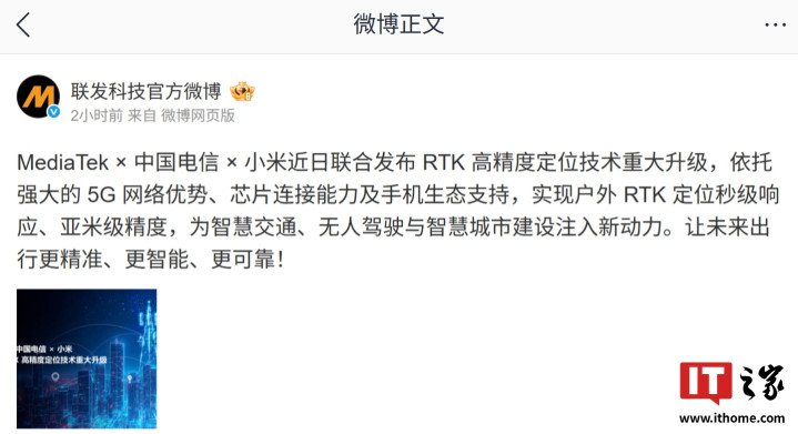 IT之家10月20日消息,联发科技官方微博今日发文称,MediaTek×中国电信×小米近日联合发布RTK高精度定位技术重大升级。