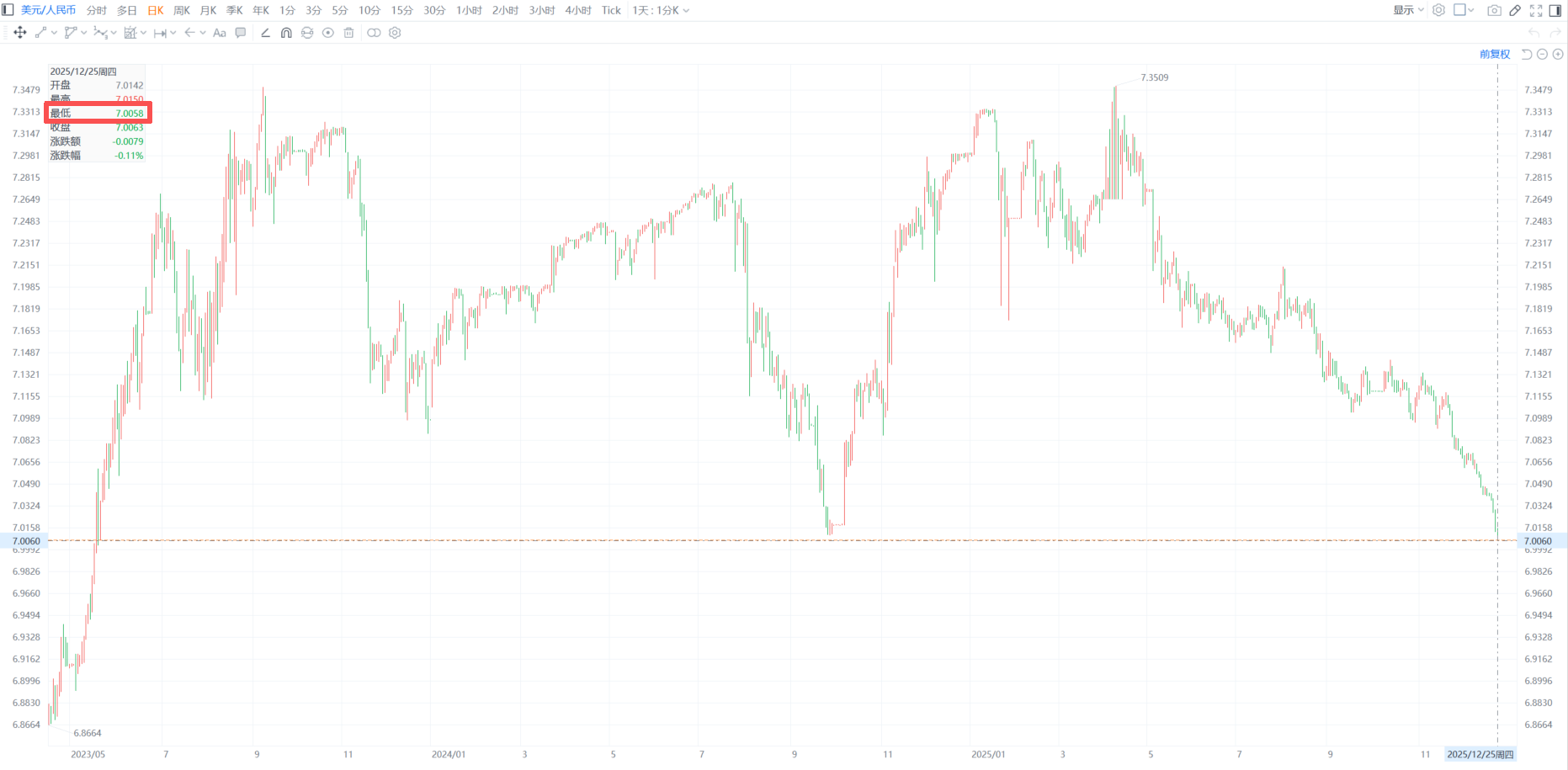 格隆汇12月25日|在岸人民币兑美元升破7.01关口,一度升至7.0058,突破了2024年9月27日的前高(7.0106),创2023年5月22日以来新高。