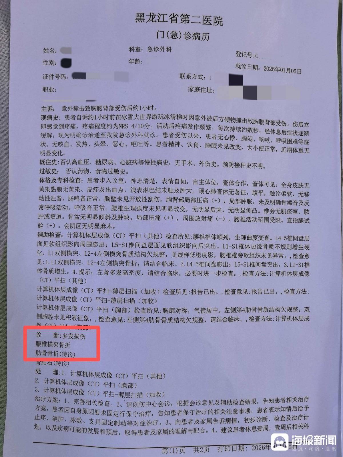 “患者自诉,约1小时前在冰雪大世界游玩冰滑梯时,因意外被后方硬物撞击,致胸腰背部受伤,伤后立即感觉到疼痛……”杜先生向记者提供了其妻子于1月5日在黑龙江省第二医院就诊的病历,诊断患者为腰椎横突骨折、肋骨骨折(待诊)等。