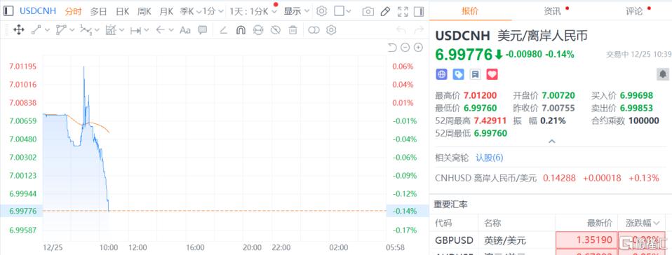 今日(12月25日),离岸人民币兑美元升破7.0大关,最高触及6.99709,续创2024年9月30日以来新高;在岸人民币兑美元升破7.01关口,一度升至7.0058,突破了2024年9月27日的前高(7.0106),创2023年5月22日以来新高。