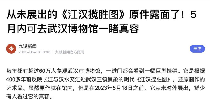 据现有资料考证,《江汉揽胜图》在2023年5月18日之前,它从未对外展出。后在当年的国际博物馆日期间得以正式露面几天。可惜,我完全错过。